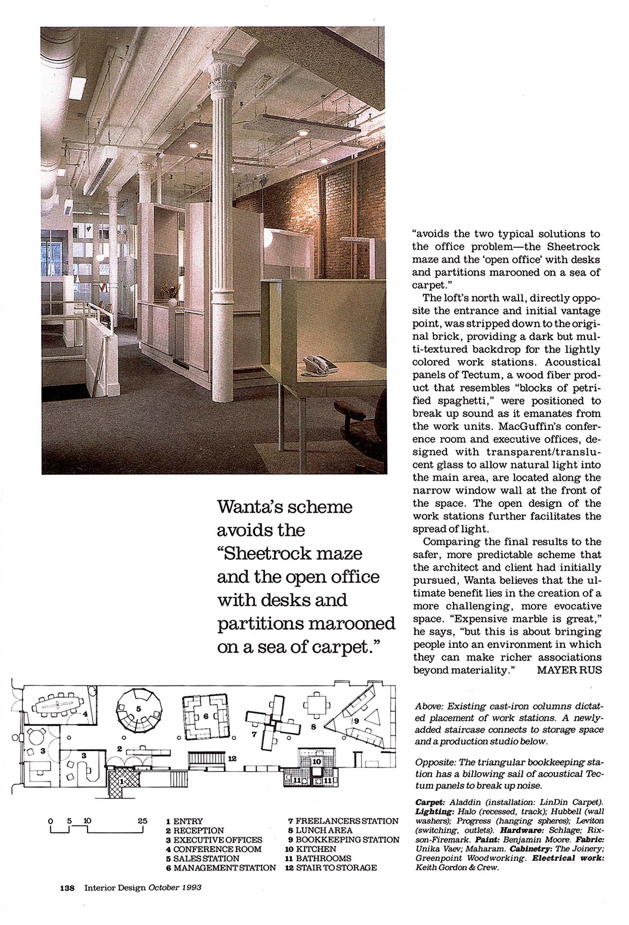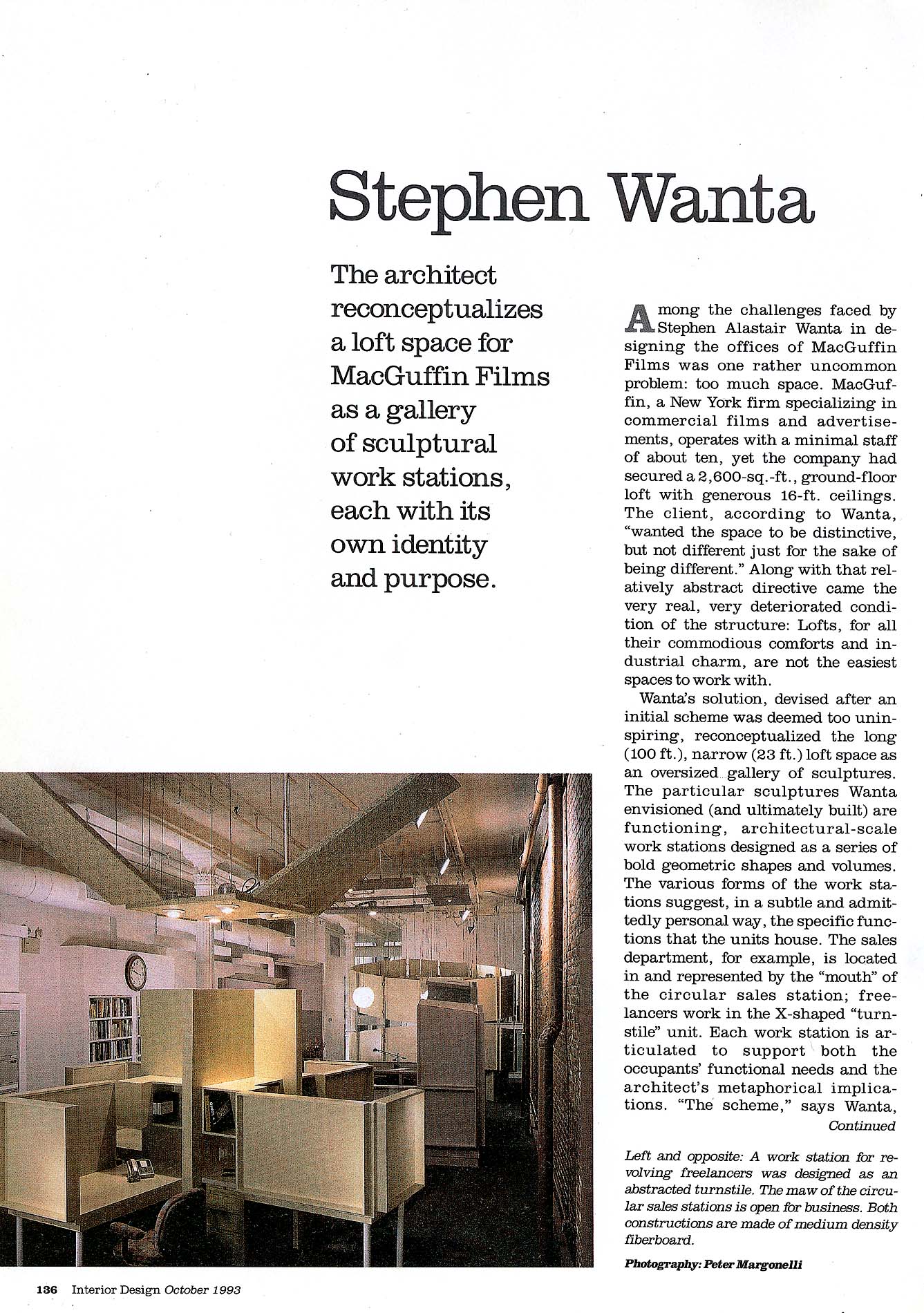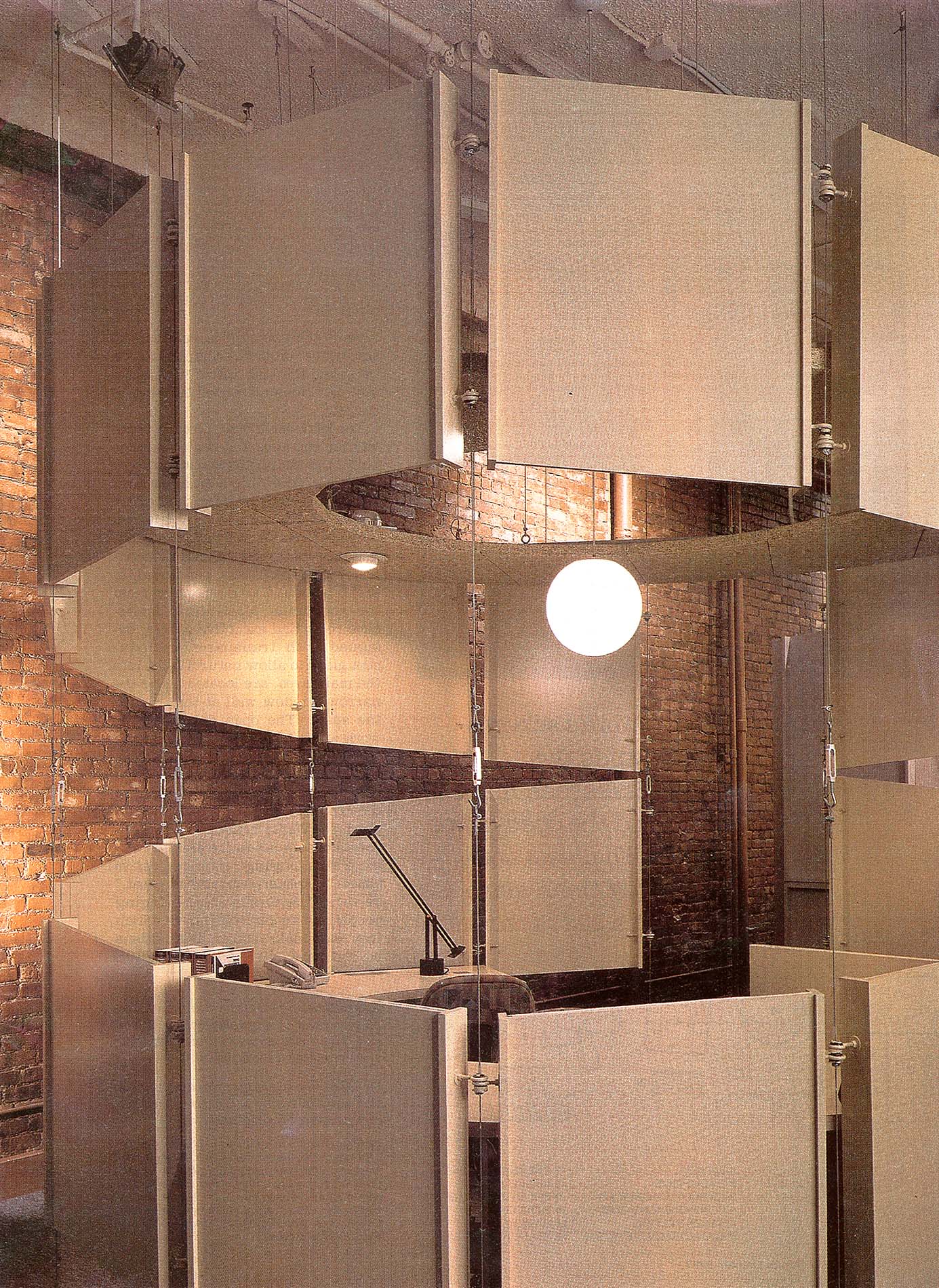 The scheme avoids both typical solutions to the office problem–the sheetrock maze or the open office with desks and partitions marooned on a sea of carpet. The open design of the “sculptures” allows light to penetrate to the back of the space, while their Tectum ceilings absorb sound and create room-like conditions within. The workstations’ distinctive configurations give each department a sense of identity, as if each has its own building. The project in effect creates a space that celebrates the functions that comprise MacGuffin Films’ office operations.