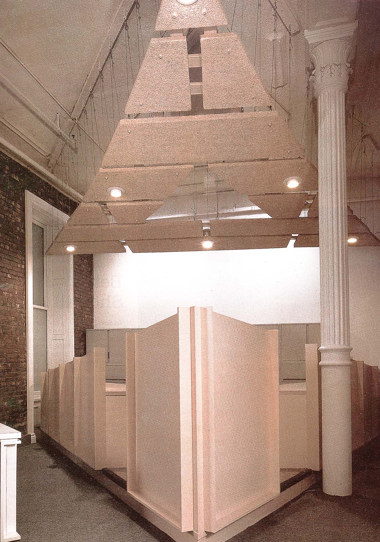 The scheme we developed envisioned the space as a gallery in which sculptures would be housed–sculptures that are actually workstations. Each workstation is based on a generic geometric shape,chosen and articulated for the needs of the occupants and for the shape’s associations with the department within, (the “mouth” of the circular sales station, the controlling “castle” of the square management station, the “turnstile” of the x-shaped freelancers’ station, and the “pyramid” of the triangular bookkeeping station).